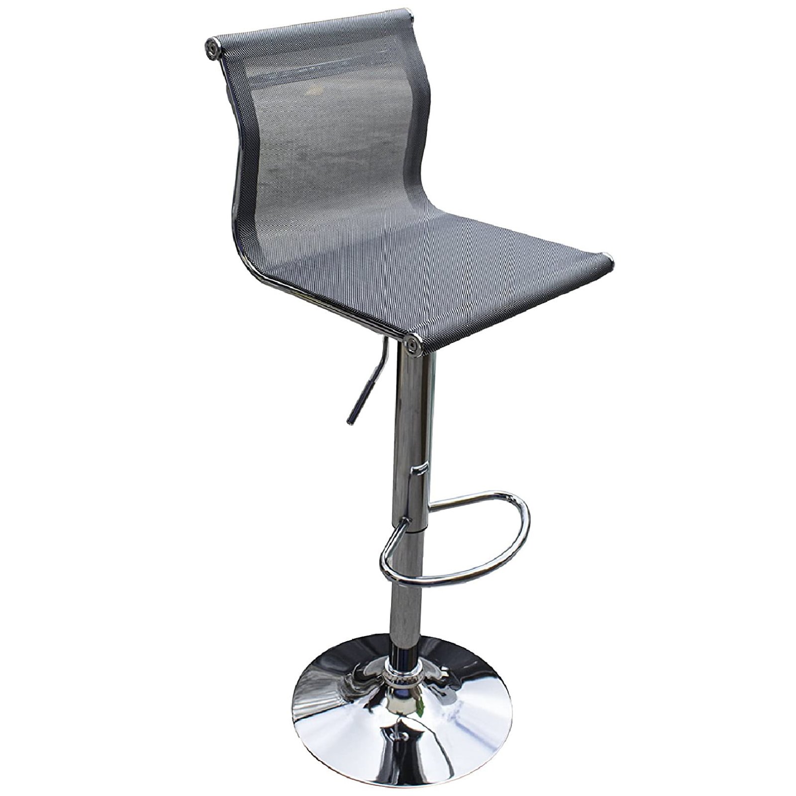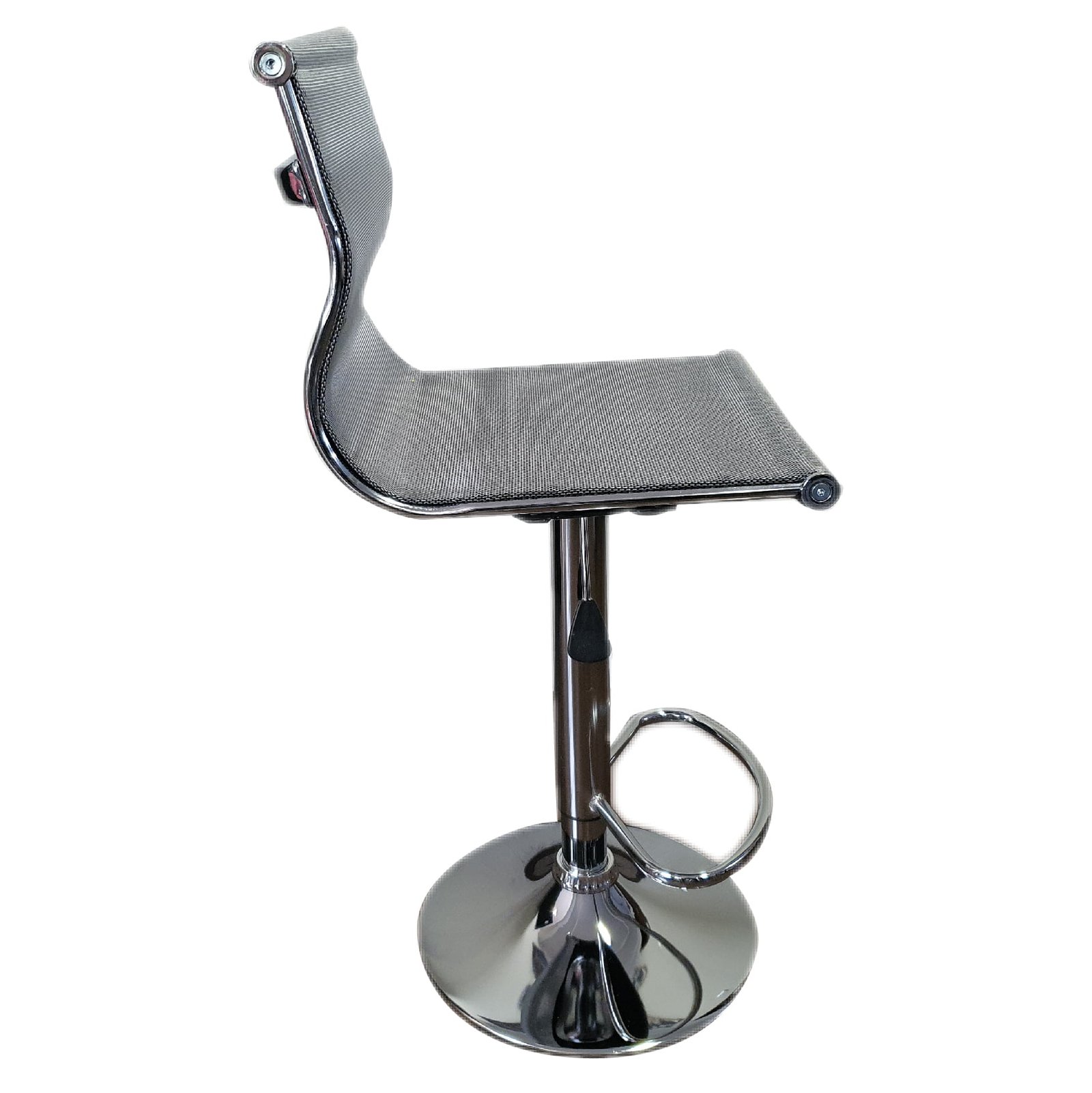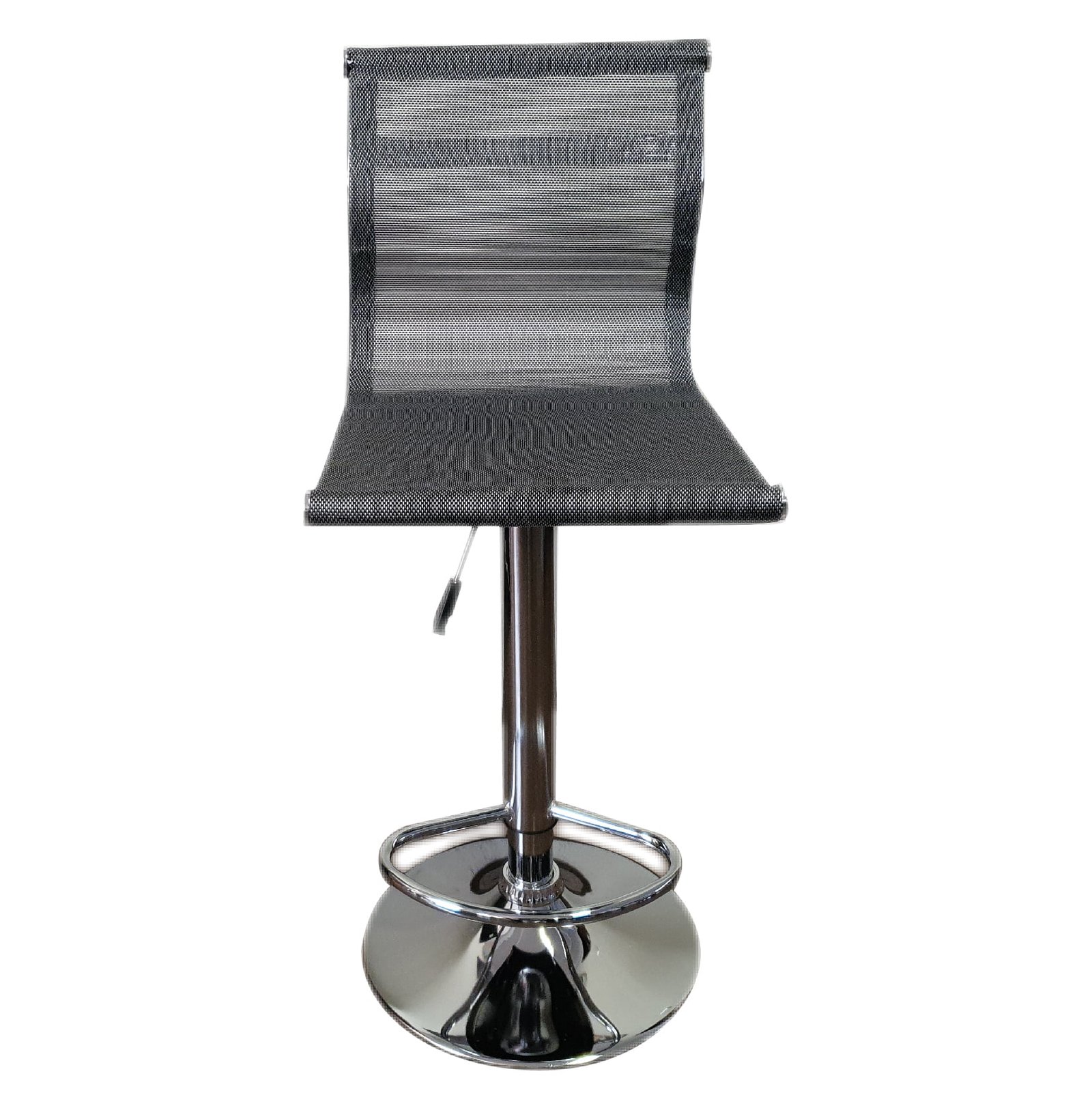 Banco con asiento tapizado en malla color aluminio , giratorio con mecanismo de pistón que permite ajustar la altura. El banco tiene la base estilo plato cromado que asegura su mayor estabilidad. Todos nuestros modelos tienen palanca de metal para mayor durabilidad. El banco es ideal para la barra desayunador, comedor o mesa de trabajo en tu casa o negocio. Es de fácil limpieza y su material lo hace altamente resistente. Este es un banco de estilo vanguardista que dará un toque especial a tu lugar.